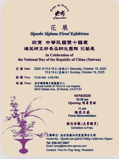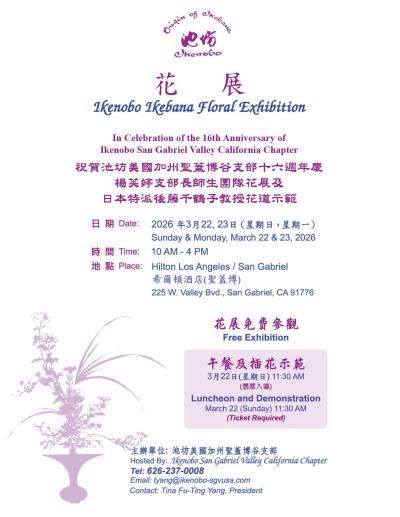 池坊為插花藝術的源流,約五百多年的歷史潮流中,一向是各派插花藝術的主流. 池坊的始祖--小野妹子為了要紀念己故聖德太子的遺德於日本京都六角堂編研出供花之道,隨著時代的進步,漸漸形成有系统的華道(插花藝術).現在的師家是第四十五代池坊專永宗匠,積極帶領所有師生為推廣池坊花道至世界各地而努力,並傳達以和為貴的精神.